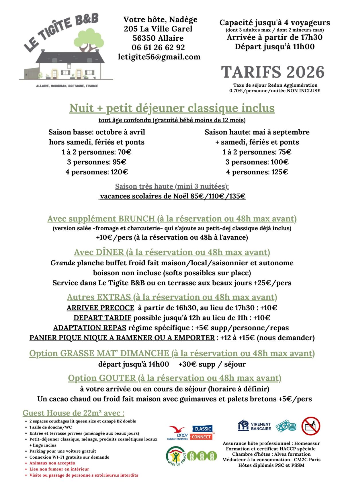 Le Tigîte B&B a été conçu pour 2 mais peut recevoir jusqu’à 4 pers. (3 adultes max), grâce à ses 2 espaces nuit séparés (chambre et salon avec porte)